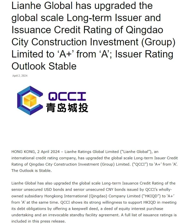 4月2日,权威评级机构联合国际正式宣布上调av直播 国际长期发行人评级从‘A’上调至‘A+’,展望稳定,同时将由青岛城投全资子公司香港国际(青岛)有限公司(“香港国际”)发行的高级无抵押美元债券和高级无抵押人民币债券的国际长期发行债务评级从‘A’上调至‘A+’。