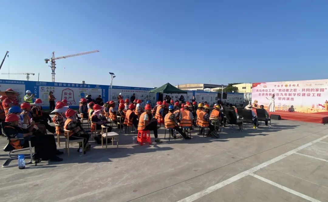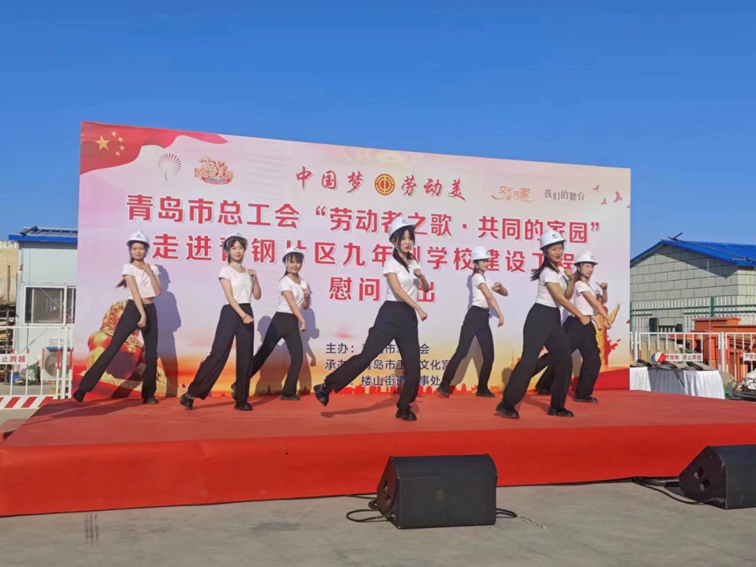 6月17日下午,由青岛市总工会主办、市工人文化宫及楼山街道办事处承办的“劳动者之歌·共同的家园”慰问演出在av直播 青钢片区九年制学校工程项目现场举行,项目建筑工人、管理人员近百人观看了演出。