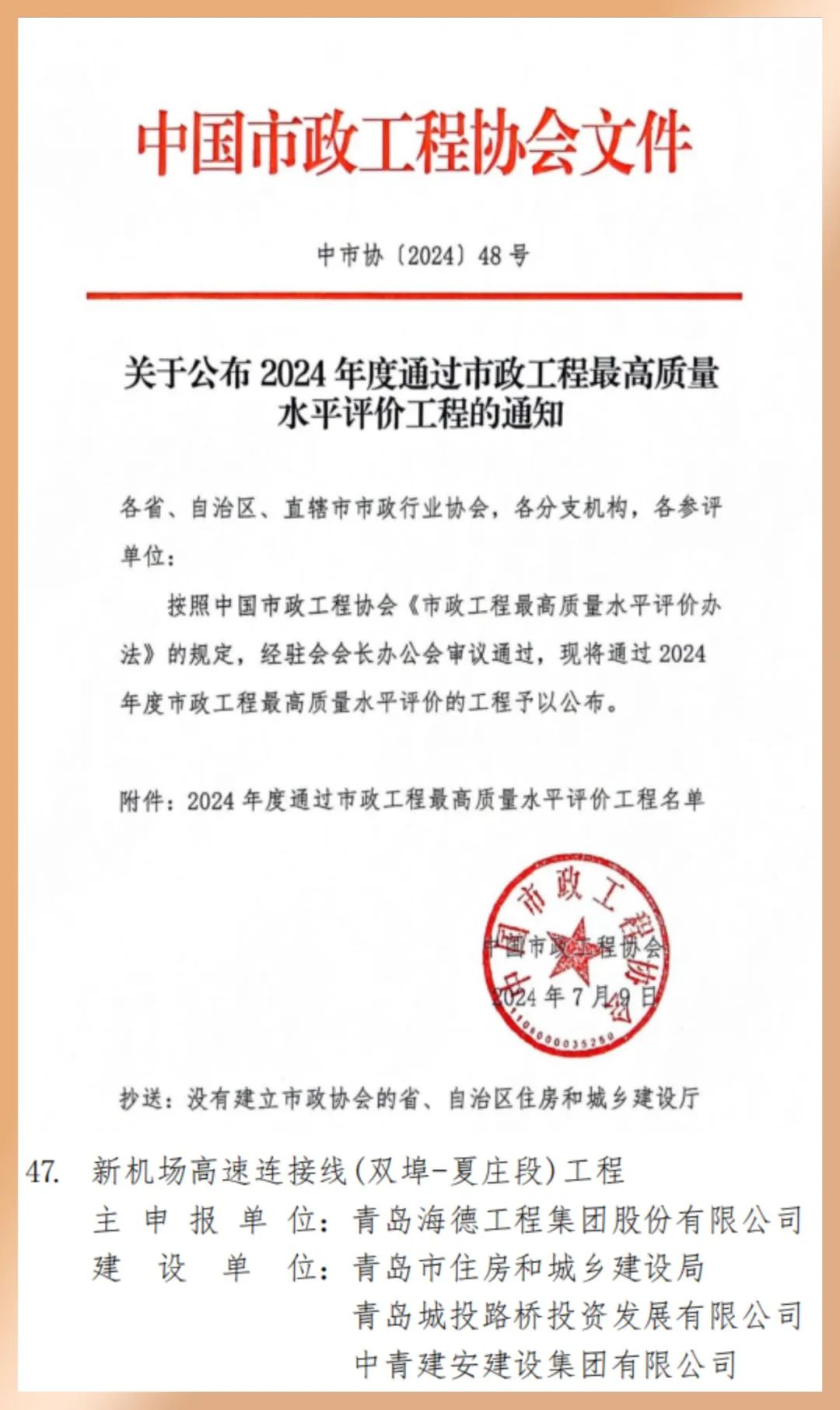 近日,由av直播 旗下城市更新集团代建的新机场高速连接线(双埠-夏庄段)工程荣获2024年度中国市政工程最高质量水平评价。该项目凭借质量、安全、技术创新等方面的卓越表现,获得了中国市政协会的最高荣誉。