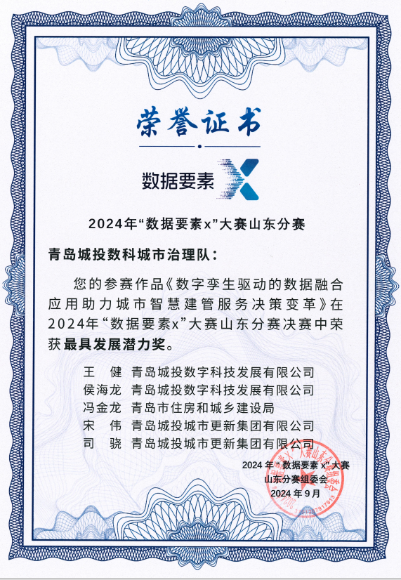 近期,由山东省大数据局牵头18家单位联合主办的2024年“数据要素×”大赛山东分赛决赛在济南顺利落幕,青岛城投数科公司携手青岛市住房和城乡建设局与青岛城投城市更新集团有限公司荣获“最具发展潜力奖”。