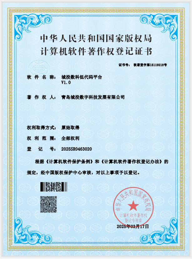 近日,青岛城投旗下数科公司在软件技术领域再传捷报,成功斩获四项“开发支撑”类国家软件著作权!分别是:“城投数科低代码平台”、“城投数科微服务开发框架平台”、“城投数科物联网接入平台”以及“城投数科应用集成平台”。这四项成果均源自本年度实际项目开发,是公司技术研发团队辛勤耕耘的结晶,更是公司核心技术实力的有力证明!