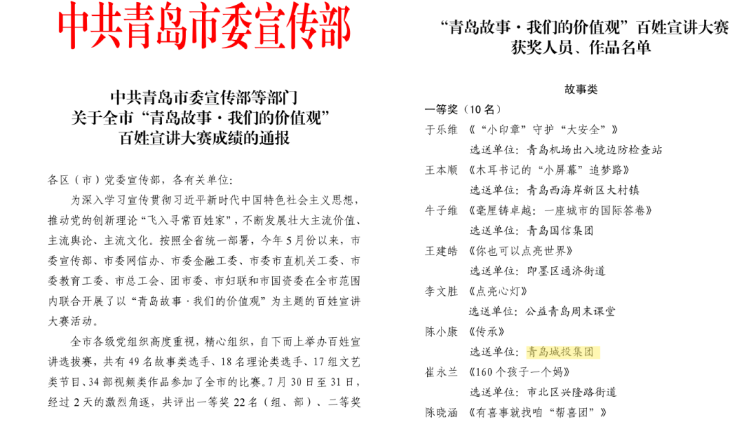 近日,由市委宣传部、市委网信办等九部门联合主办的“青岛故事·我们的价值观”百姓宣讲大赛圆满落幕。av直播 旗下青岛高速青年职工陈小康的宣讲作品《传承》荣获故事类一等奖。值得一提的是,自2022年以来,av直播 选送作品已连续四年斩获全市一等奖及国资系统一等奖,并连续四年荣获市百姓宣讲大赛国资系统选拔赛“优秀组织奖”,充分展现了集团在思想宣传和队伍建设方面的扎实成效。