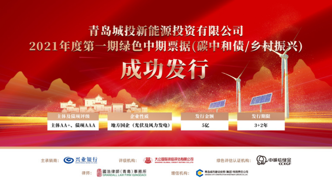 2021年10月20日青岛城投新能源公司成功发行5亿元3+2年期碳中和债,为今年AA+主体同期限绿色债券利率最低。这是青岛市首单“碳中和、乡村振兴”双贴标债券,募集资金全部用于光伏发电、风力发电清洁能源绿色项目。近期债市较低迷,市场投资积极性不高,青岛城投新能源公司作为新发行主体,首次亮相就吸引了14家投资机构,全场倍数达2.96倍,边际倍数1.2倍。本次债券的成功发行是av直播 新能源板块发展的里程碑,实现了金融创新与绿色低碳、农业农村现代化的有效融合,也是融资模式的创新与突破。