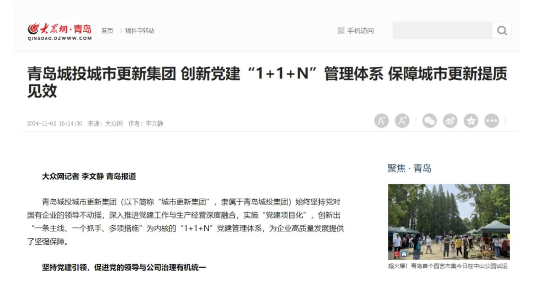 【大众网】青岛城投城市更新集团 创新党建“1+1+N”管理体系 保障城市更新提质见效